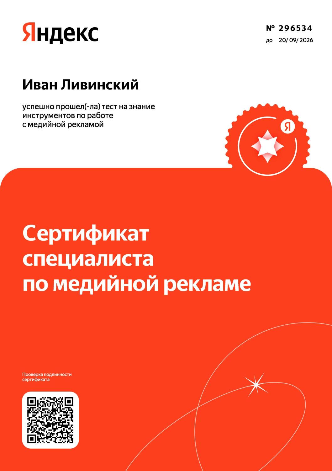 Сертификат специалиста по медийной рекламе Яндекс