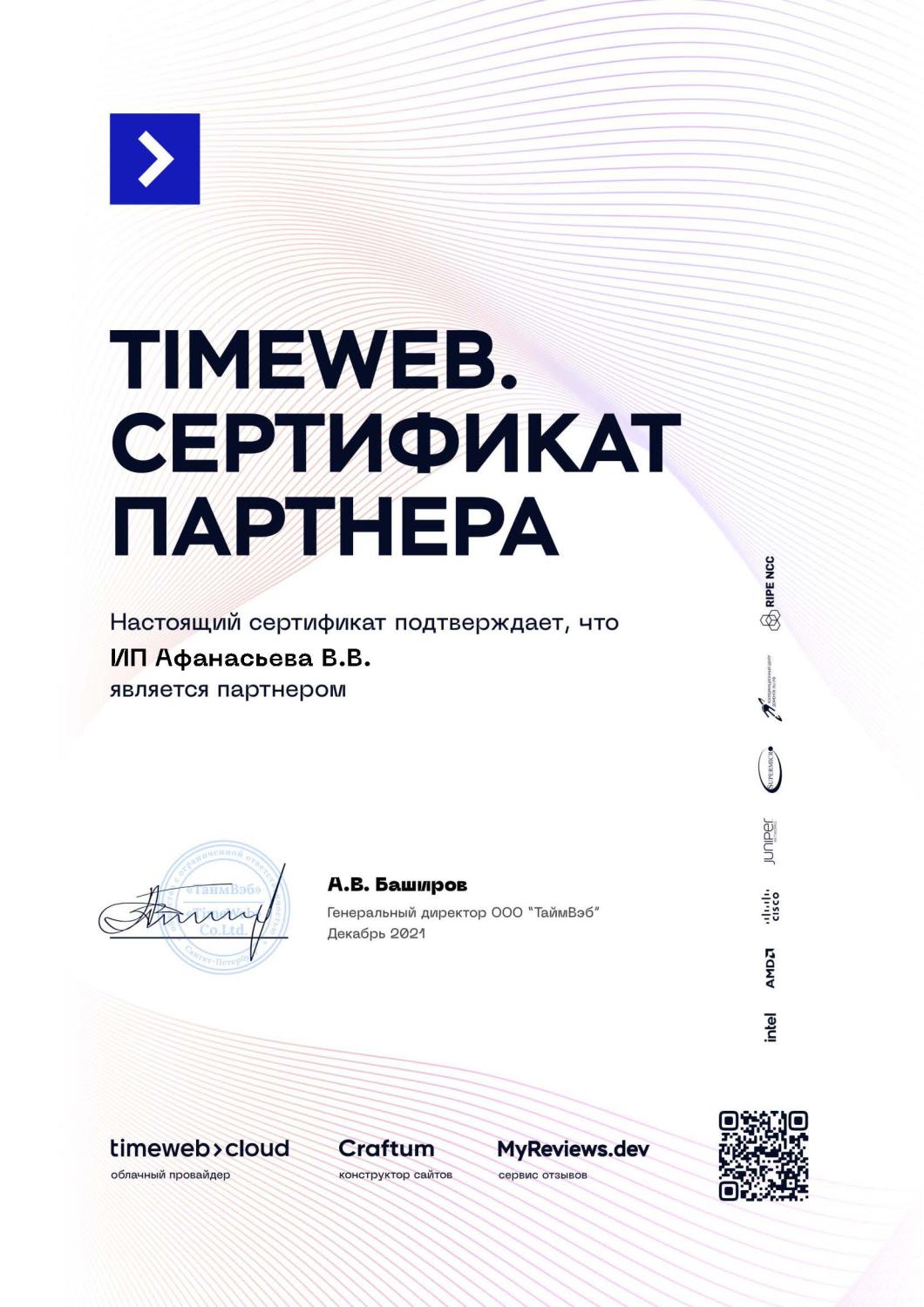 Сертификат партнёра Timeweb