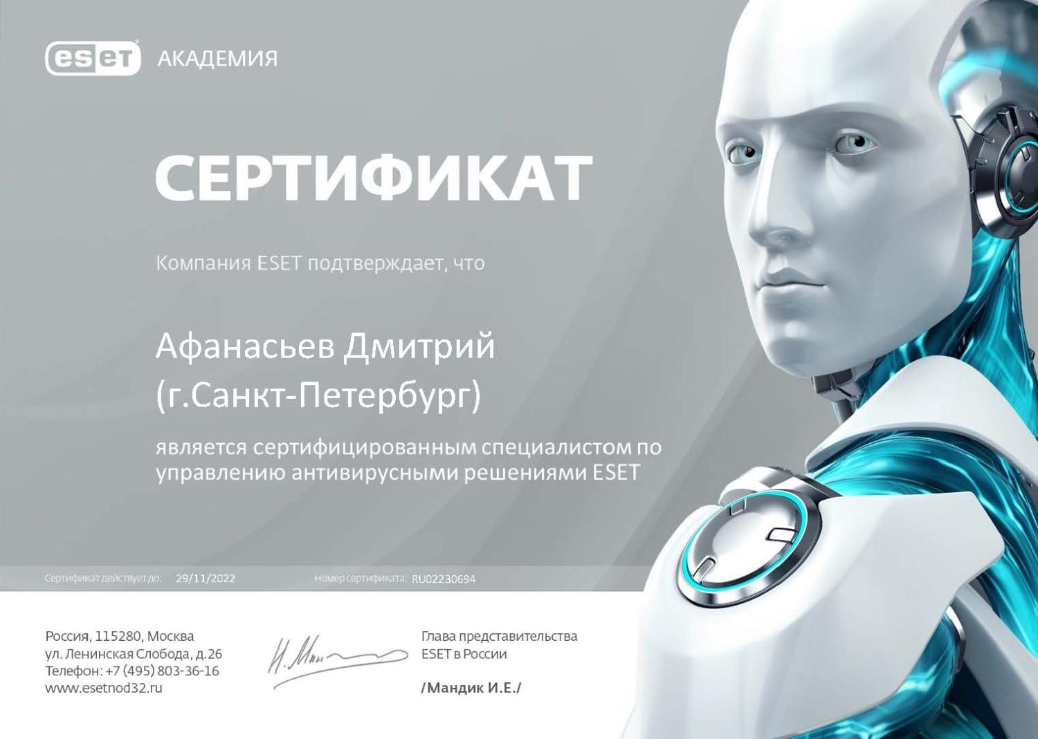Сертифицированный специалист по управлению антивирусными решениями ESET (9-е поколение)